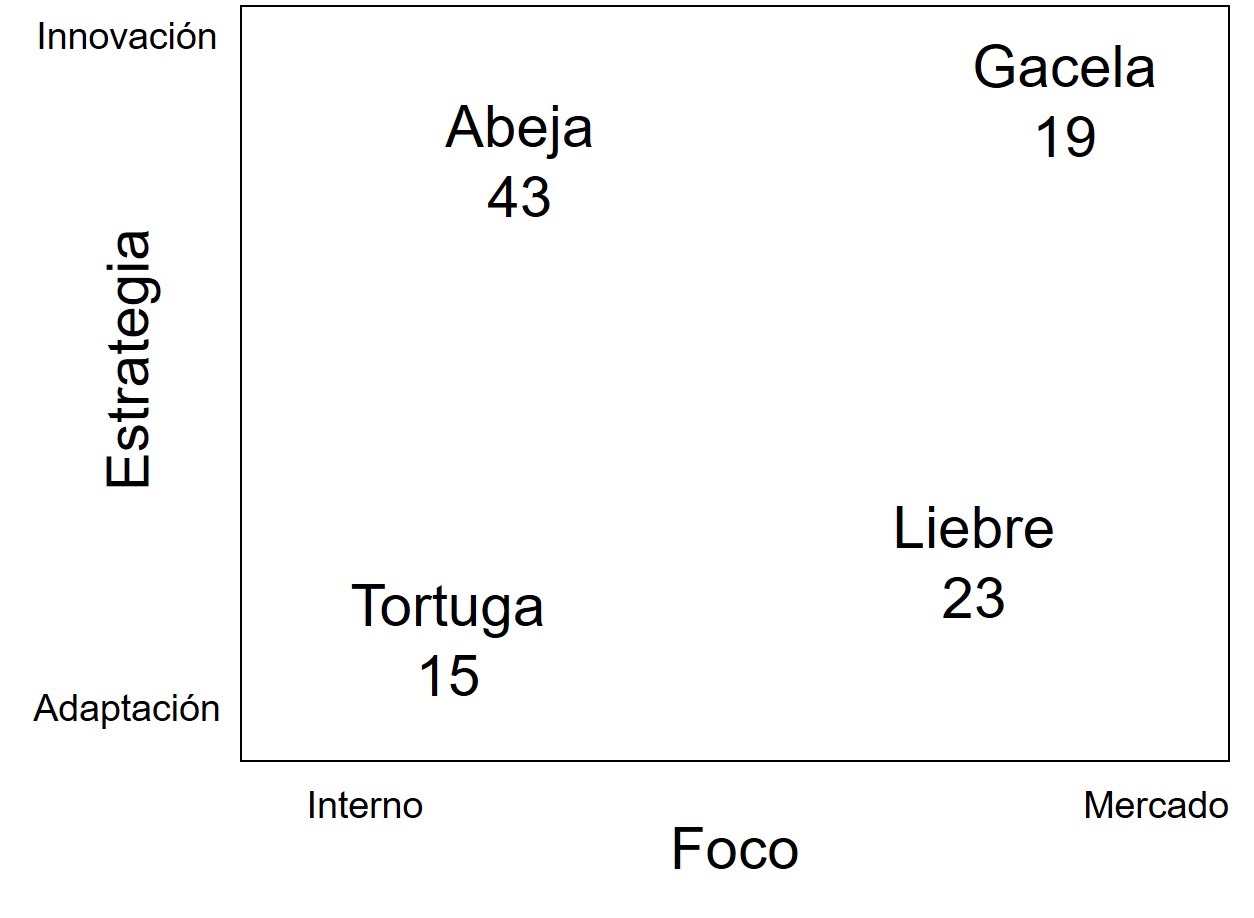 | Liebre | Pyme en crecimiento. Gran rapidez de adaptación y propensa al riesgo, pero sin métodos claros. | Implementar métodos ágiles para dar estructura a su rapidez y usar inteligencia de mercado. |