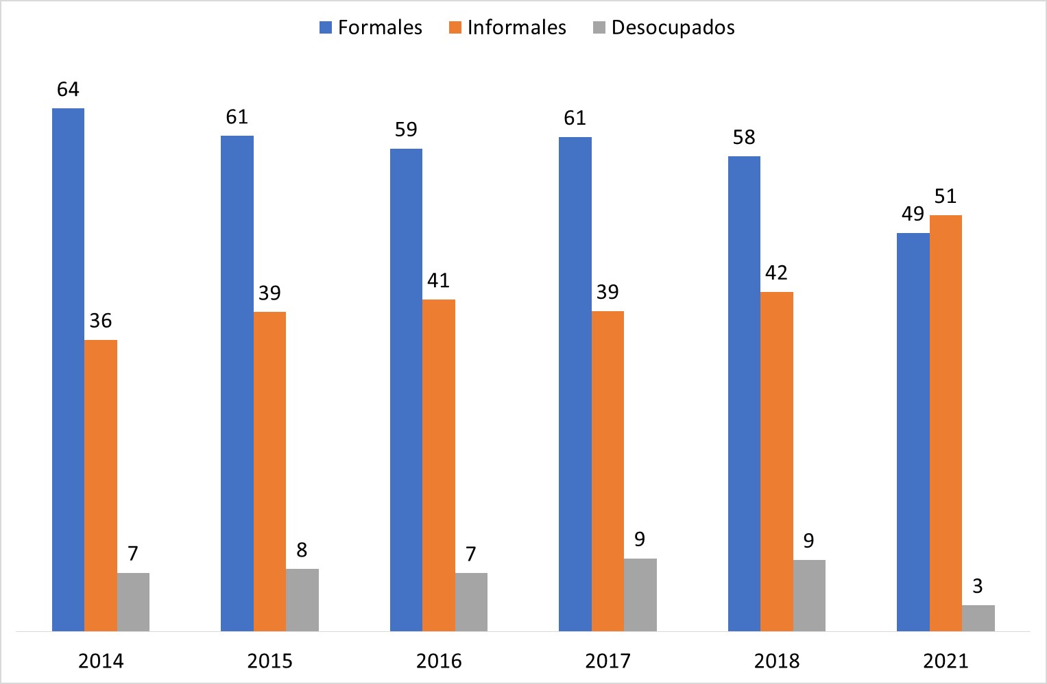 Este aumento de la informalidad ocurrió en un contexto de contracción económica, bajos salarios y reducción de la actividad en sectores clave como manufactura, transporte y construcción. En 2021 poco más de 5 millones de personas trabajaban en el sector informal, mientras que el empleo formal cayó de 7,5 millones en 2014 a 4,9 millones en 2021, una disminución del 34 por ciento.